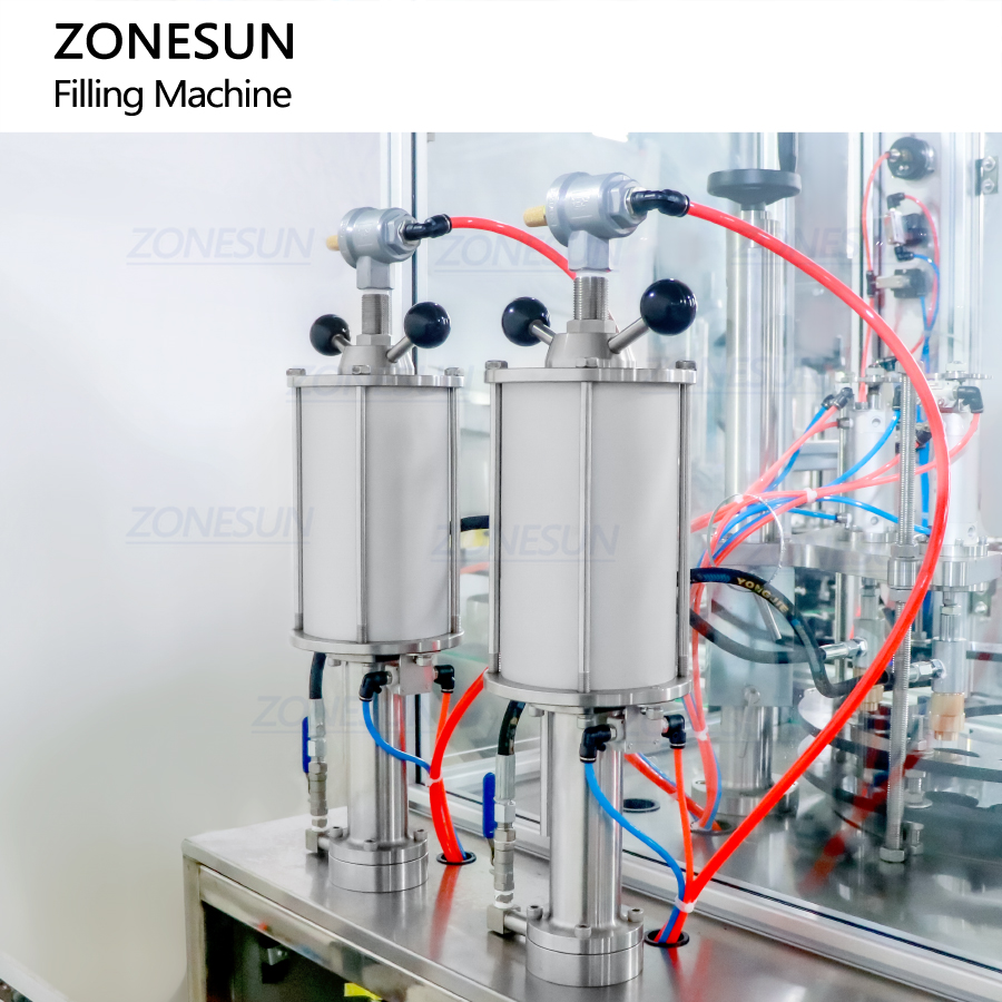 Пневмоцилиндр машины для газового аэрозоля работает совместно с воздушным компрессором; объём подачи газа регулируется при помощи воздушного клапана.